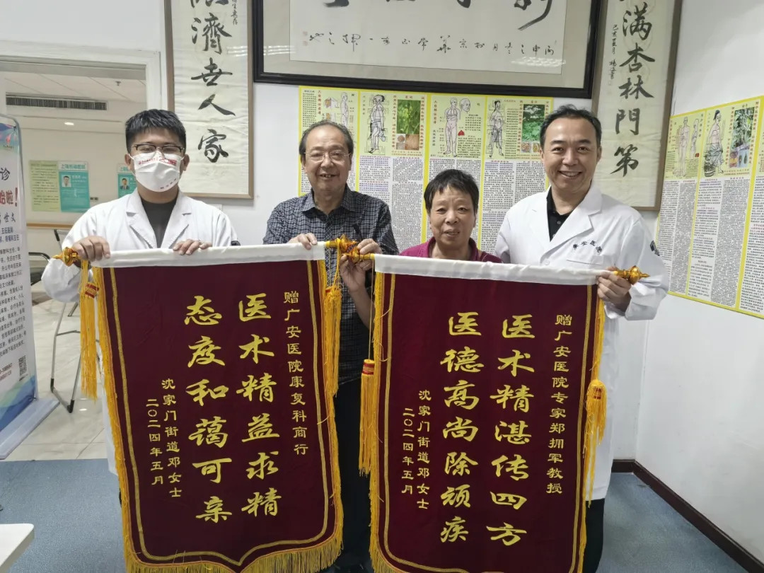 近日,廣安醫(yī)院疼痛科迎來了一幕溫馨感人的場景?;颊哙嚺亢图覍偈峙?面繡有“醫(yī)術精湛傳四方,醫(yī)德高尚除頑疾”、“醫(yī)術精益求精,態(tài)度和藹可親”字樣的錦旗,滿懷感激之情地來到科室,將這份特別的禮物親手交到了鄭擁軍醫(yī)生和助手商行的手中。
