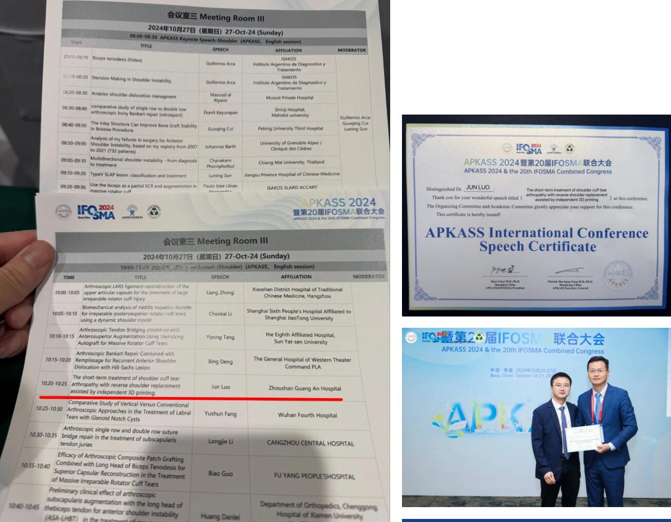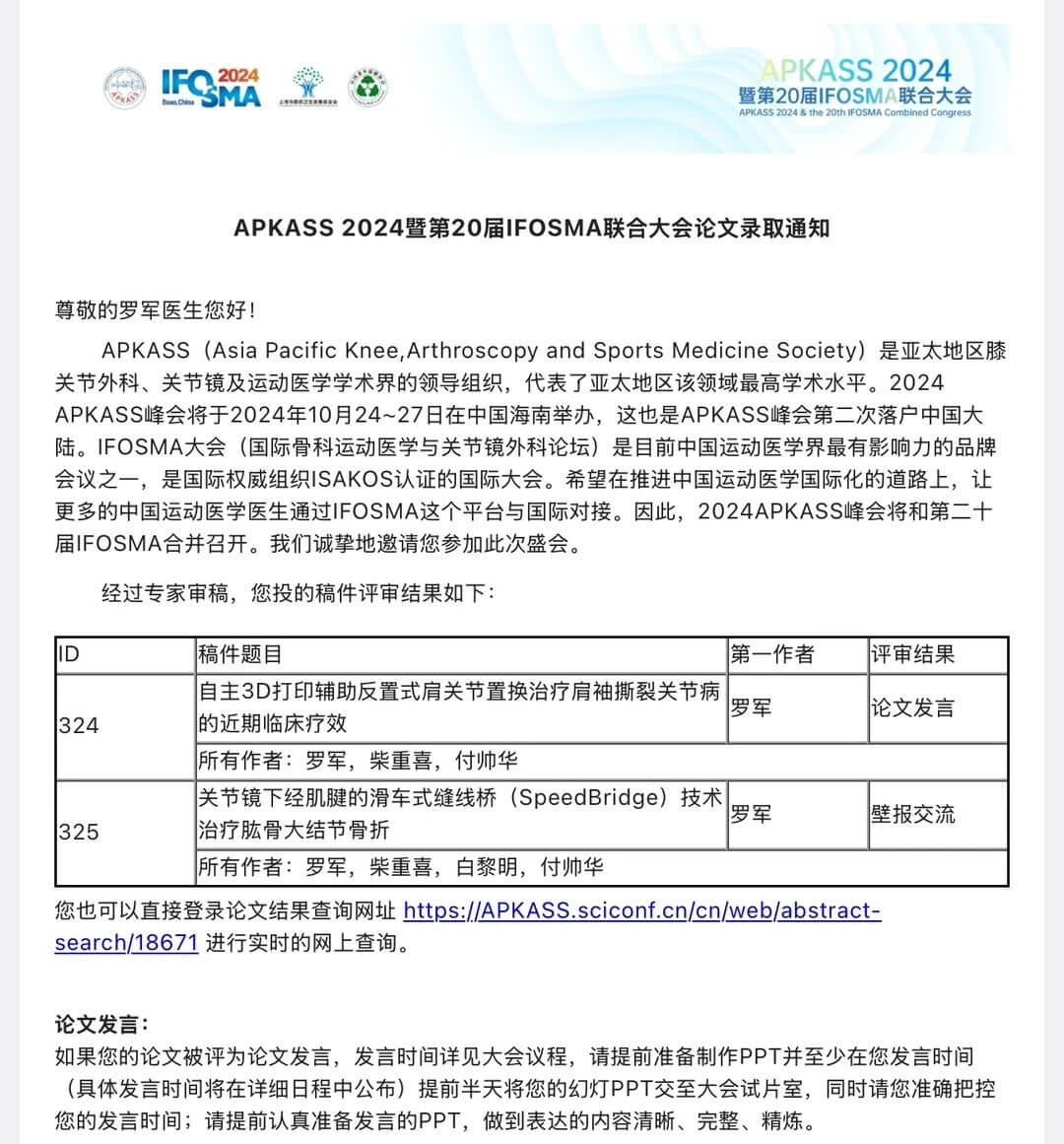 2024年10月24日—27日,亞太膝關(guān)節(jié)、關(guān)節(jié)鏡、運(yùn)動(dòng)醫(yī)學(xué)會(huì)(APKASS)2024年會(huì)暨第20屆國(guó)際骨科運(yùn)動(dòng)醫(yī)學(xué)與關(guān)節(jié)鏡外科論壇(IFOSMA)聯(lián)合大會(huì)在海南博鰲亞洲論壇舉行。我院副院長(zhǎng)羅軍主任受邀參加大會(huì)并在會(huì)上做相應(yīng)發(fā)言。