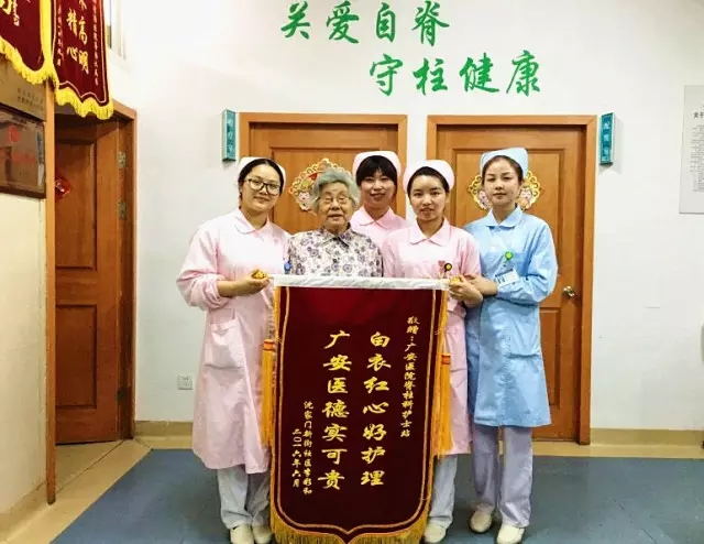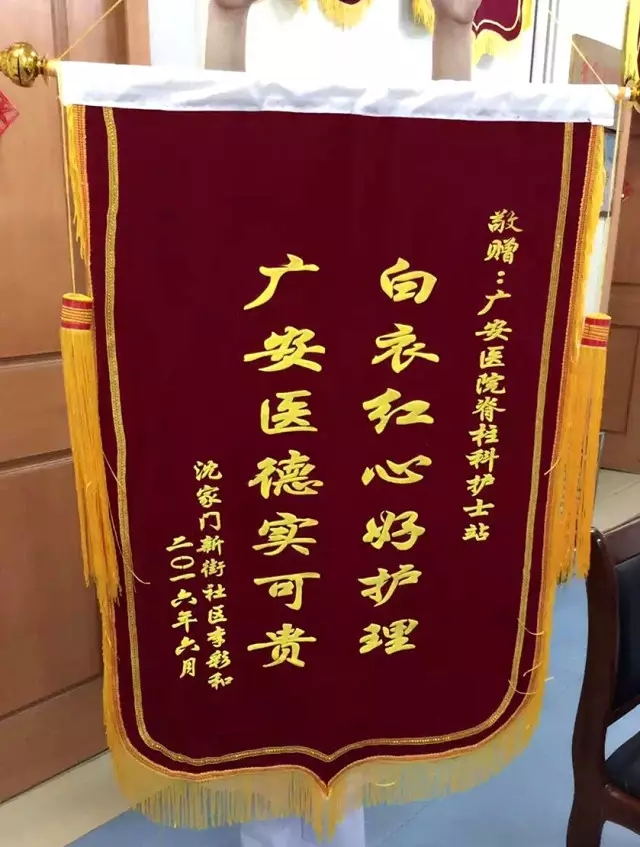 5月31日上午,廣安醫(yī)院脊柱科護(hù)士站收到一面錦旗,上面寫著:“白衣紅心好護(hù)理,廣安醫(yī)德實(shí)可貴”的字樣,送錦旗的是一位李阿姨。