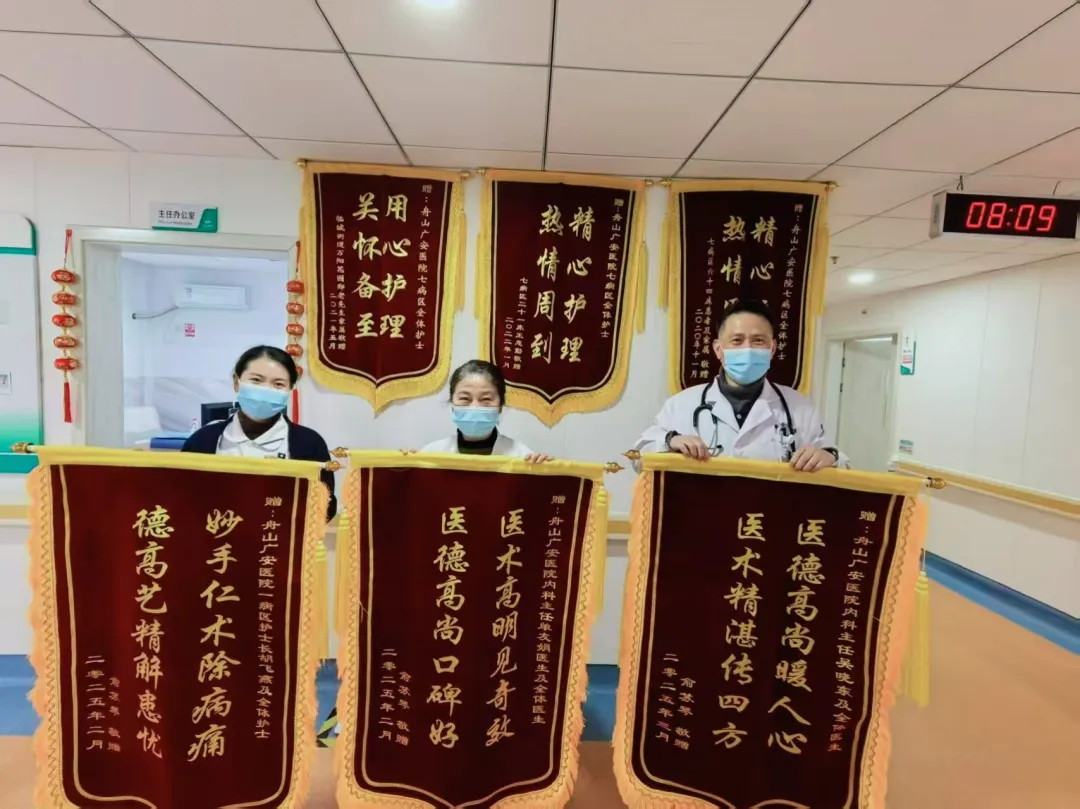 無(wú)獨(dú)有偶,毛阿婆一家都與這個(gè)科室結(jié)下不解之緣。毛阿婆本人身患多種疾病(偏癱、冠心病、房顫、腦梗死恢復(fù)期、心功能二級(jí)等等),多次在我們科室治療;她的家人也曾在內(nèi)科病區(qū)治療??苾?nèi)醫(yī)生護(hù)士的親切態(tài)度讓家屬非常滿意,賀冬燕醫(yī)生在診療時(shí)總會(huì)輕聲鼓勵(lì),康復(fù)師會(huì)根據(jù)她的病情設(shè)計(jì)專(zhuān)屬訓(xùn)練方案,護(hù)士們更是將毛阿婆視作家人細(xì)心照顧。為表示感謝,毛阿婆的女兒特地送上錦旗。
