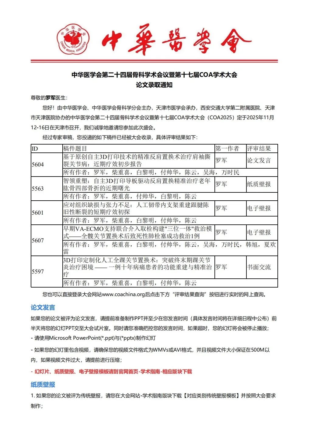 本次的成果不僅是單一的亮點(diǎn),更是團(tuán)隊(duì)整體實(shí)力的展現(xiàn)。除1篇“大會(huì)發(fā)言”外,另有3篇論文入選壁報(bào)交流,1篇入選書面交流,實(shí)現(xiàn)了全部投稿均獲錄用。這種“重點(diǎn)突破,協(xié)同共進(jìn)”的局面,生動(dòng)地反映了我院骨科扎實(shí)的學(xué)術(shù)基礎(chǔ)和良好的科研氛圍。