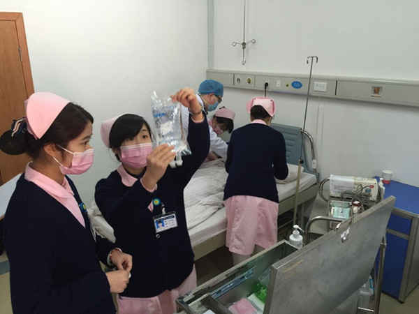 此次演練模擬情況為:一年老女性右脛腓骨骨折保守治療5天突發(fā)胸悶、胸痛不適,護(hù)士巡視病房時(shí)發(fā)現(xiàn)立即通知醫(yī)生,即予心電監(jiān)護(hù)、持續(xù)吸氧,開放靜脈通道予平衡液500ml靜滴,完善相關(guān)急診輔助檢查,通知內(nèi)科醫(yī)生會診。輔助檢查結(jié)果示:心肌梗死,血化驗(yàn)示心肌酶譜值增高。經(jīng)內(nèi)科會診后醫(yī)囑予活血、升壓等對癥治療,幾分鐘后病人發(fā)生心臟驟停,馬上對病人進(jìn)行心肺復(fù)蘇,腎上腺素針1mg靜推。在醫(yī)護(hù)人員的全力救助下,病人心肺復(fù)蘇成功。