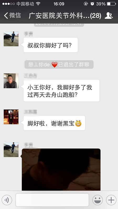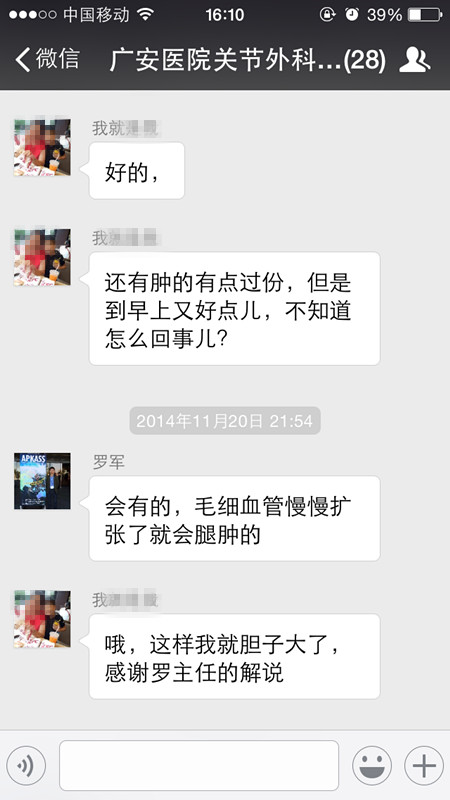 “廣安醫(yī)院關(guān)節(jié)外科朋友群”,已有患者28人,患者朋友們可以通過(guò)照片、視頻,多人、單一對(duì)話(huà)的模式,跟全科醫(yī)生或科主任咨詢(xún),更可以相同病種間的患者私下交流。