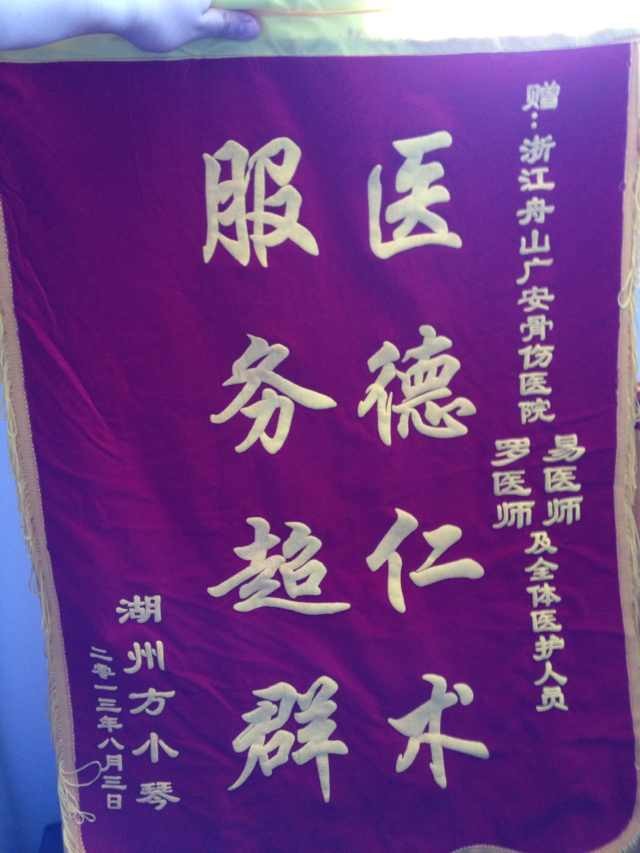 今年8月,時(shí)隔手術(shù)時(shí)間已經(jīng)一年了,方女士千里迢迢從湖州再次趕來(lái)我院,為的只是進(jìn)行內(nèi)固定拆除術(shù)。其實(shí)拆除手術(shù),是一個(gè)很簡(jiǎn)單的手術(shù),在普通醫(yī)院都能完成??沙鲇趯?duì)我院的信任和感激,方女士特地讓兒子開(kāi)車從湖州趕到舟山。手術(shù)結(jié)束后,方女士顯得激動(dòng)萬(wàn)分。她說(shuō):感謝廣安醫(yī)院醫(yī)生護(hù)士的高超技術(shù)以及細(xì)心照顧,讓我的腿恢復(fù)的這么好。雖然湖州離舟山要好幾個(gè)小時(shí)的車程,可是我不覺(jué)得辛苦,因?yàn)槲抑肋@里有最好的醫(yī)生護(hù)士等著我,我對(duì)他們的技術(shù)與服務(wù)感到非常的放心。這面錦旗不值錢,可卻代表了我對(duì)廣安醫(yī)院的感激之情。
