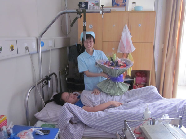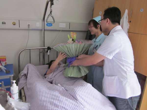 中醫(yī)正骨科醫(yī)護人員為生日的劉小姐送上鮮花