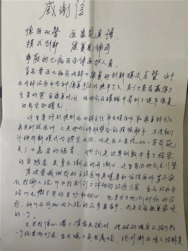 正如張大爺信中所言,是廣安醫(yī)院治療+康復的創(chuàng)新治療模式,為廣大患者贏得了寶貴的黃金康復時間。是內科和康復科醫(yī)生的珠聯(lián)璧合、強強聯(lián)手,讓患者們相信康復的曙光就在眼前。