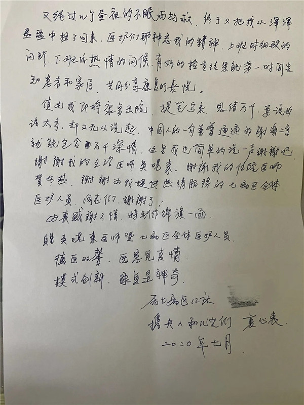 8月17日上午,在出院前,張大爺將一封手寫的感謝信及兩面錦旗分別交到了在他住院期間悉心醫(yī)護他的醫(yī)護人員的手上,以感謝他們在這半年多來的盡心救治與關懷。