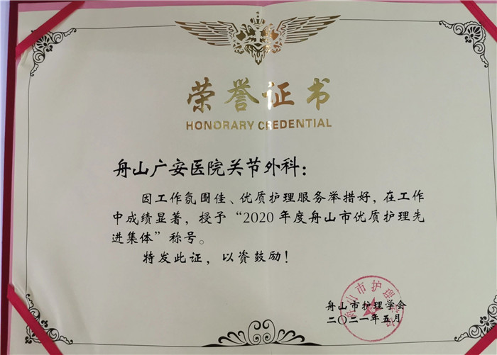 經(jīng)舟山市衛(wèi)健委、舟山市護理學會評定,我院關(guān)節(jié)外科在護士長劉燕的帶領(lǐng)下,憑借扎實的理論基礎(chǔ)、高超的護理技術(shù)、嚴謹?shù)穆殬I(yè)操守、人性化的服務理念被評選為“2020年度舟山市優(yōu)質(zhì)護理先進集體”。