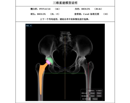 據(jù)羅軍主任介紹,他們首先將鄭阿姨的術(shù)前CT數(shù)據(jù)導(dǎo)入到系統(tǒng)中,通過自動識別骨盆和股骨建立了計算機數(shù)字三維模型。AI HIP顯示患者適合使用合適的髖臼杯、股骨柄、標(biāo)準(zhǔn)陶瓷球頭、陶瓷內(nèi)襯,并精準(zhǔn)定位了截骨線,有效幫助醫(yī)生在手術(shù)中做到精確截骨。