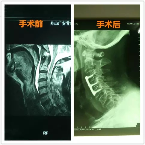 臘月二十六,王阿伯成功接受了由劉志安院長(zhǎng)主刀的頸前路減壓植骨融合內(nèi)固定術(shù)。術(shù)后王阿伯的病痛迅速得到緩解,雙肩以下上肢疼痛立馬改善,雙手肌力有所恢復(fù),雙上肢已能抬舉。術(shù)后恢復(fù)情況也非常理想,術(shù)后3天王阿伯即可下地行走,并于術(shù)后1周后拆線出院。出院時(shí)檢查時(shí),王阿伯雙上肢抬舉過(guò)頭頂,雙肩以下上肢疼痛消失,雙手腕以下皮膚感覺(jué)遲鈍較前明顯好轉(zhuǎn),雙上肢各關(guān)節(jié)活動(dòng)恢復(fù)接近正常。