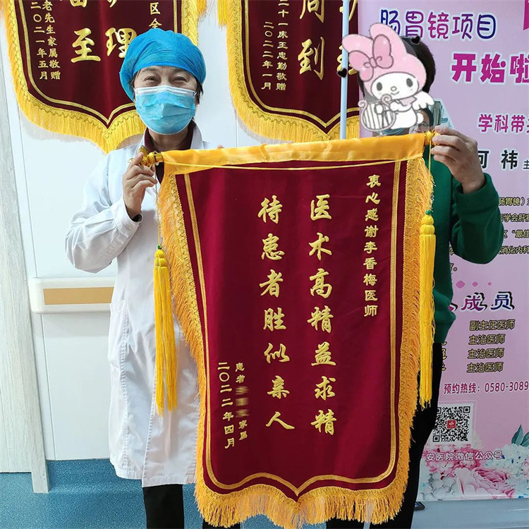 一面小小的錦旗,飽含患者及家屬對康復科全體醫(yī)護人員的感謝、鼓勵及肯定。李香梅醫(yī)生表示:““一面錦旗不僅僅代表了患者和家屬對病區(qū)的感謝,也是對我們醫(yī)療工作的肯定。在今后的工作中,康復病區(qū)全體醫(yī)護人員將不斷提高醫(yī)療技術水平更好地為患者服務!”