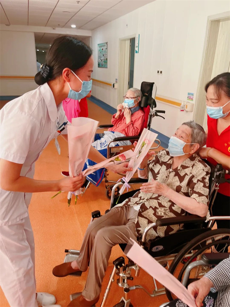 醫(yī)護(hù)人員將可口美味的節(jié)日小蛋糕和鮮花遞到張爺爺?shù)氖稚?,老人開心的笑成了一條直線。張爺爺說:“這蛋糕真好吃,住在這里真好,家的味道”!小小的蛋糕和鮮花包含深深的祝福,祝福天下老人幸福、健康、平安,快樂。