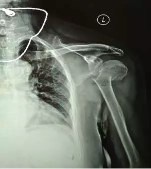 70多歲的鮑阿婆在家人陪同下來(lái)到上海大團(tuán)醫(yī)院就診。大團(tuán)醫(yī)院的醫(yī)生給鮑阿婆左肩部做了X線片檢查。片子拍出來(lái)竟然是左肱骨近端粉碎性骨折。外科頸,大結(jié)節(jié)都碎了,而且骨折端移位很?chē)?yán)重。