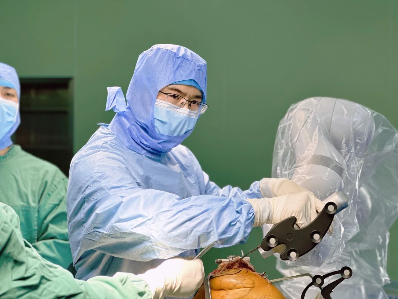術(shù)中,羅軍主任和手術(shù)團(tuán)隊(duì)成員柴重喜醫(yī)師在可視化影像導(dǎo)航下,借助機(jī)器人手臂對磨損的膝關(guān)節(jié)表面進(jìn)行精準(zhǔn)打磨。之后又在機(jī)器人的輔助下,將關(guān)節(jié)假體精準(zhǔn)植入患者體內(nèi),首例手術(shù)一個小時順利完成。
