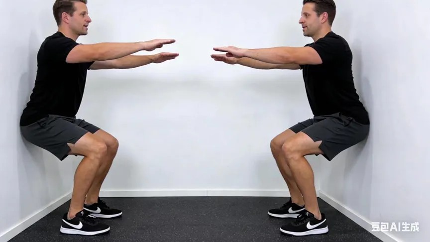 背部貼墻,雙腳與肩同寬, 緩慢下蹲至膝蓋微屈(不超過90度), 保持30秒,重復3次。